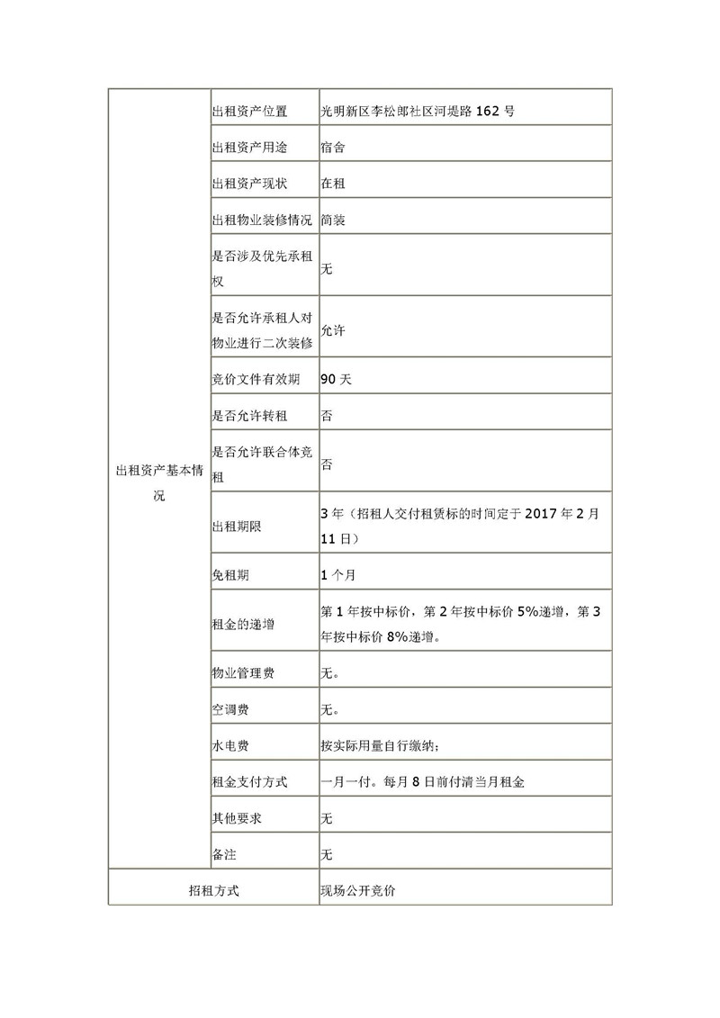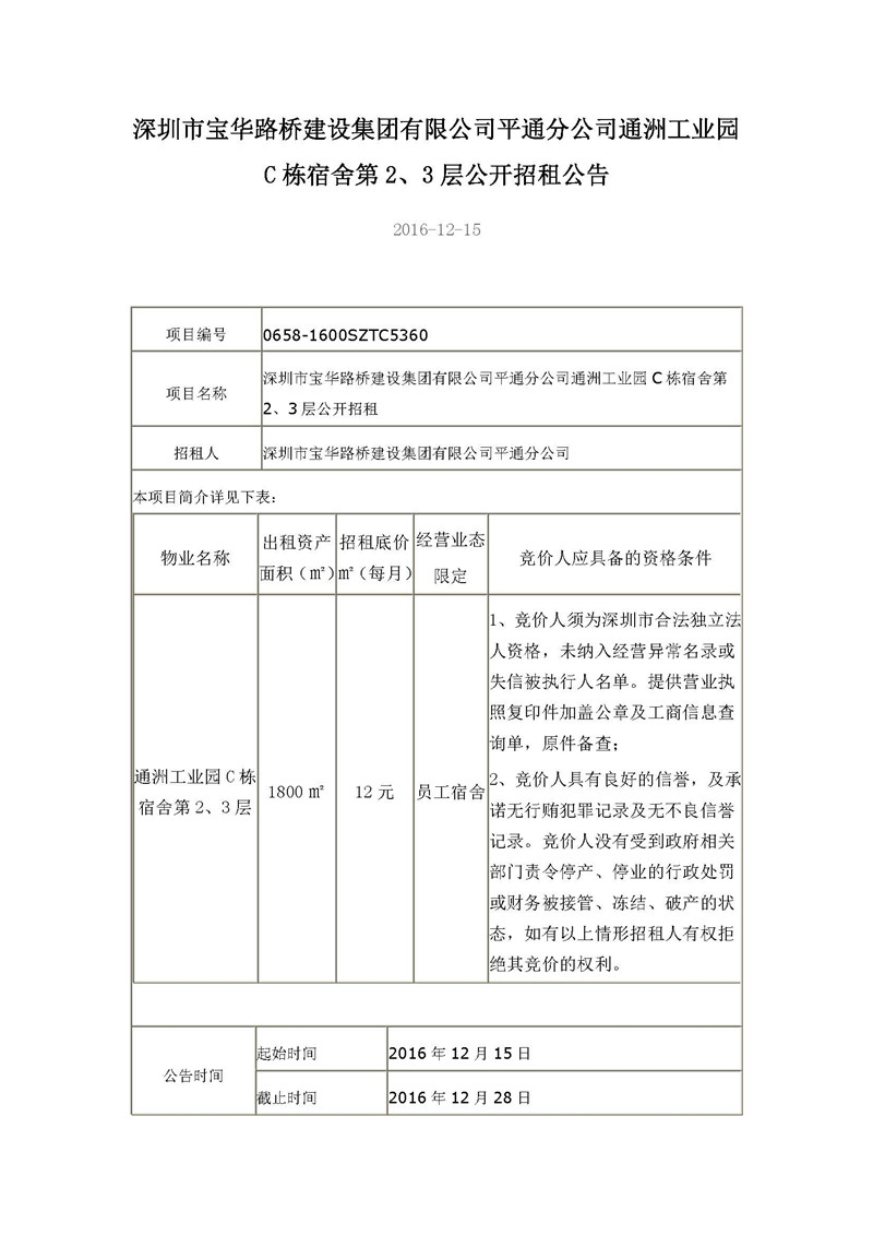 深圳市宝华路桥建设集团有限公司平通分公司通洲工业园C栋宿舍第2、3层公开招租公告