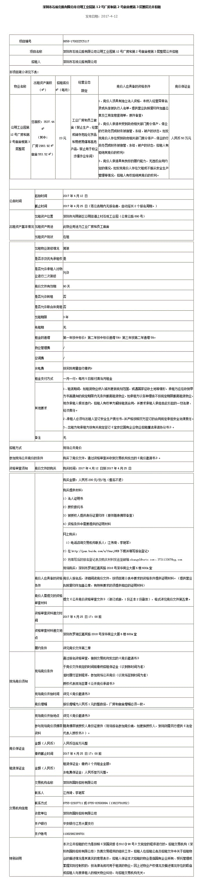 石观公明工业园第12号厂房和第2号宿舍楼第3层整层物业公开招租租赁项目公告