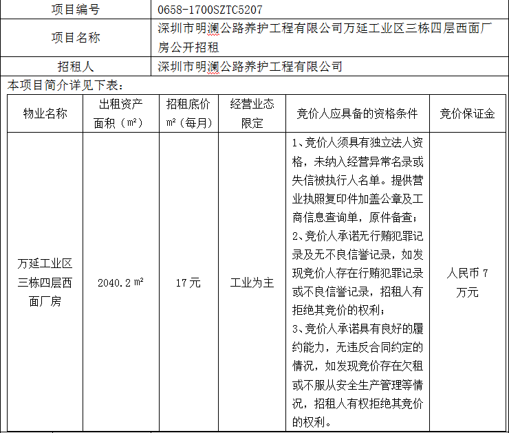 深圳市明澜公路养护工程有限公司万延工业区三栋四层西面厂房公开招租公告