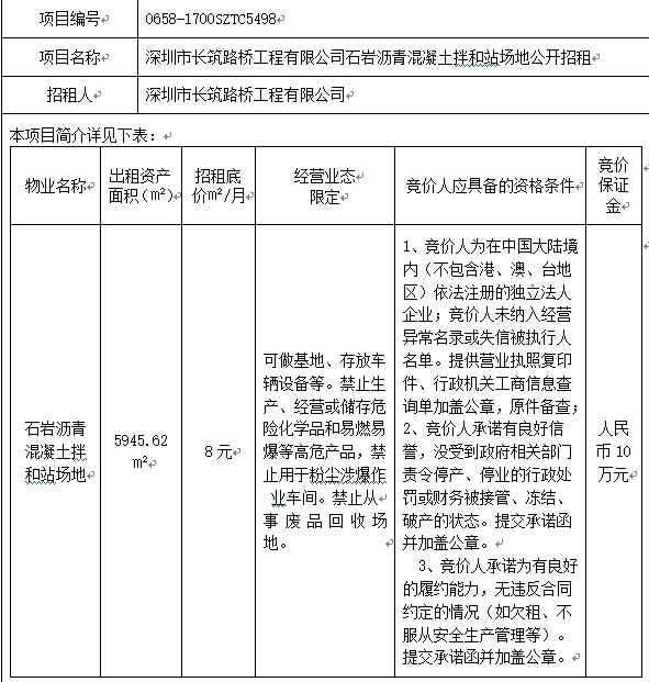 深圳市长筑路桥工程有限公司石岩沥青混凝土拌和站场地公开招租公告