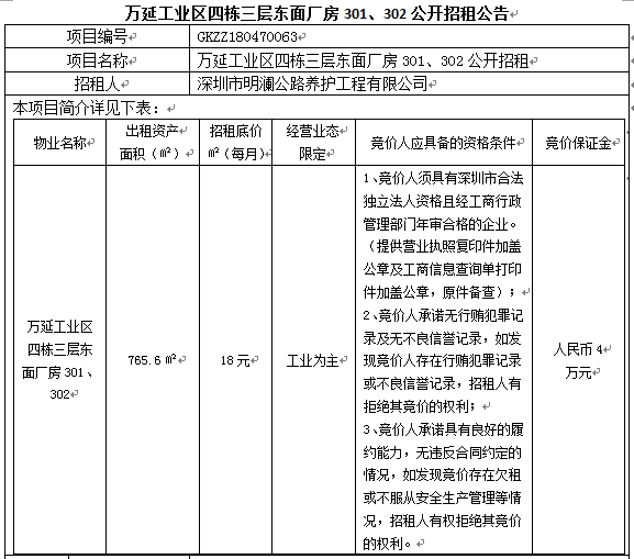 万延工业区四栋三层东面厂房301、302公开招租公告