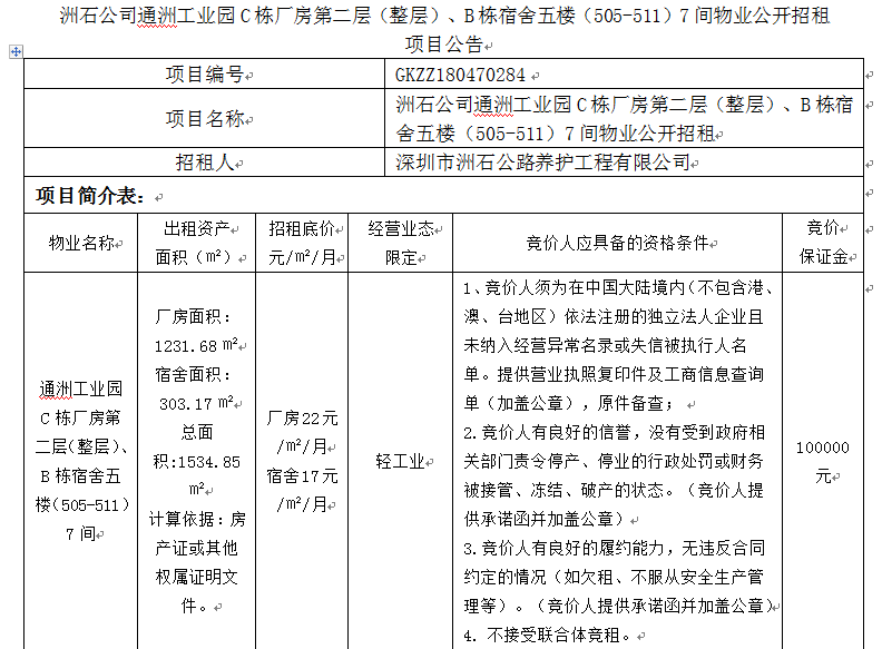 洲石公司通洲工业园C栋厂房第二层(整层)、B栋宿舍五楼(505-511)7间物业公开招租项目公告