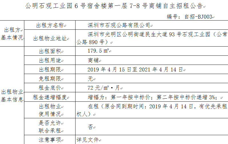 公明石观工业园6号宿舍楼第一层7-8号商铺自主招租公告