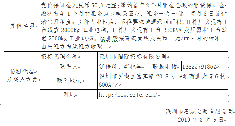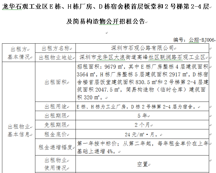 龙华石观工业区E栋、H栋厂房、D栋宿舍楼首层饭堂和2号梯第2-4层 及简易构造物公开招租公告