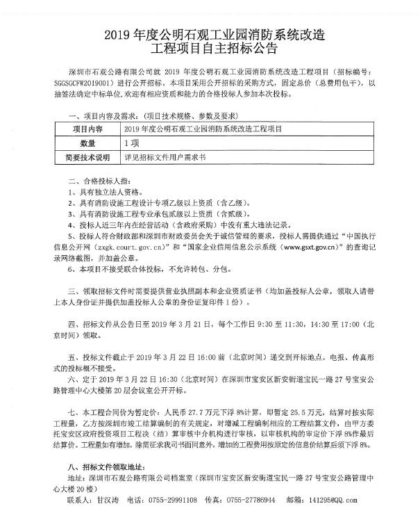 2019年度公明石观工业园消防系统改造工程自主招标公告