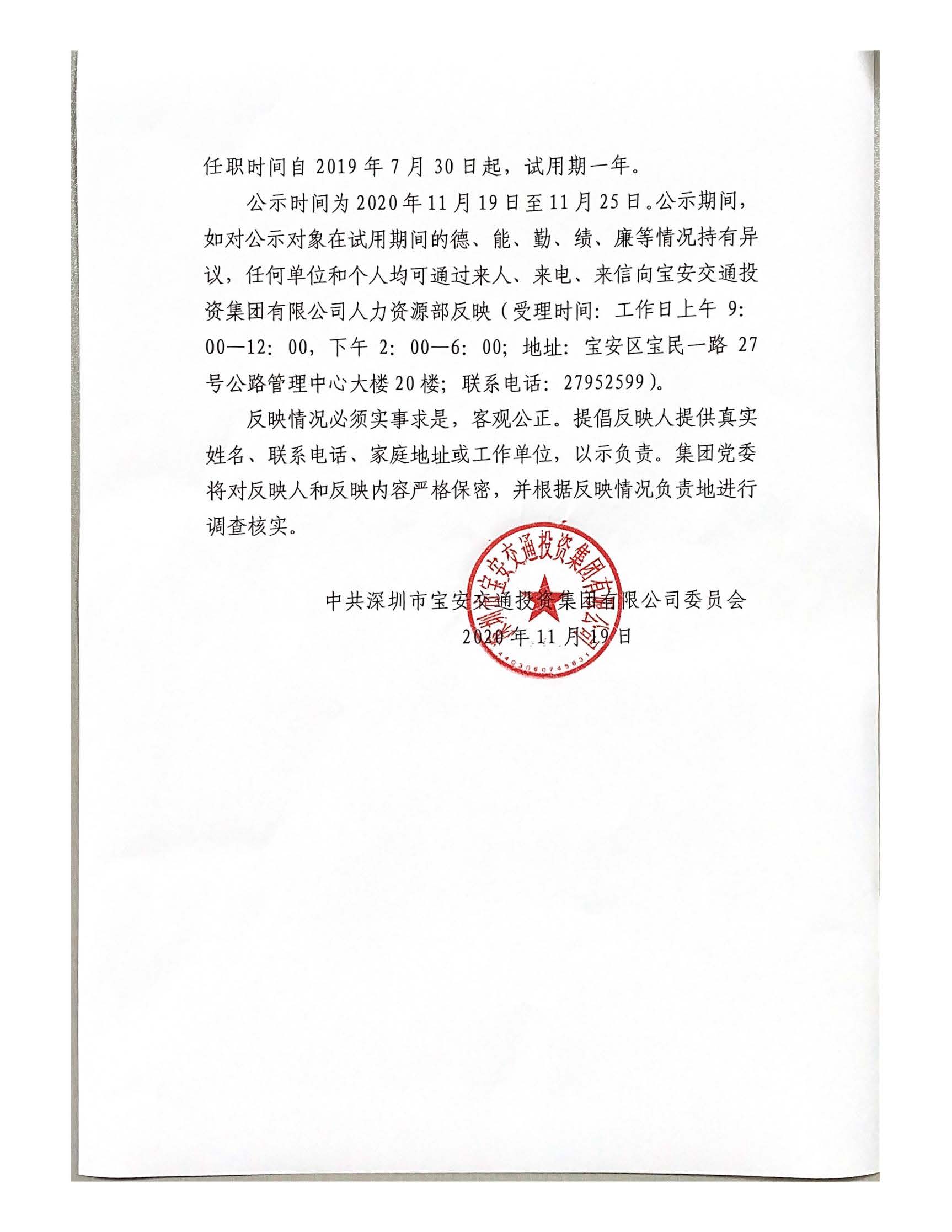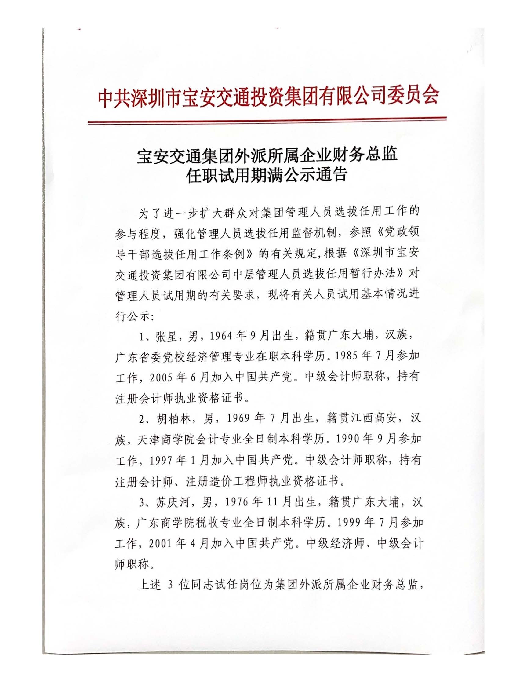 宝安交通集团外派所属企业财务总监任职试用期满公示通告