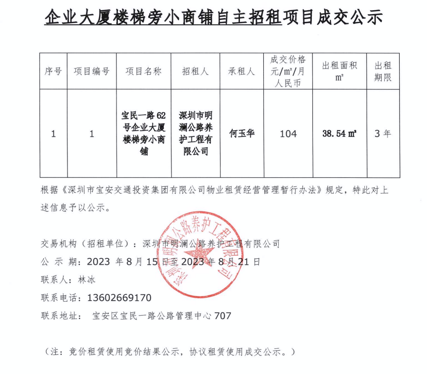 企业大厦楼梯旁小商铺自主招租项目成交公示