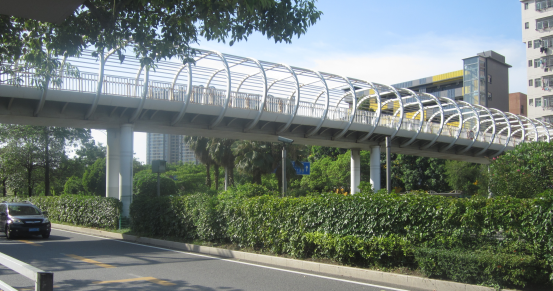 该项目由我集团下属长筑路桥公司实施。项目位于宝安大道新安、西乡段,翻身村、共乐村、固戍二路三座人行天桥为预应力钢筋混凝土人行天桥,碧海湾和机场实验学校两座人行天桥为钢结构人行天桥。施工内容为人行天桥的上部结构、下部结构、地基与基础、桥面及梯道面铺装、栏杆以及安装等工程内容。