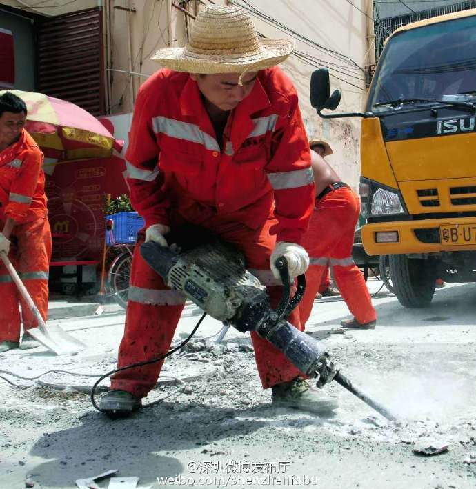 #微美瞬间# 【第六期】龙华新区,公路养护人员冒着酷暑在路面上劳动。(本文转自6月11日深圳微博发布厅 网友:朱军民)