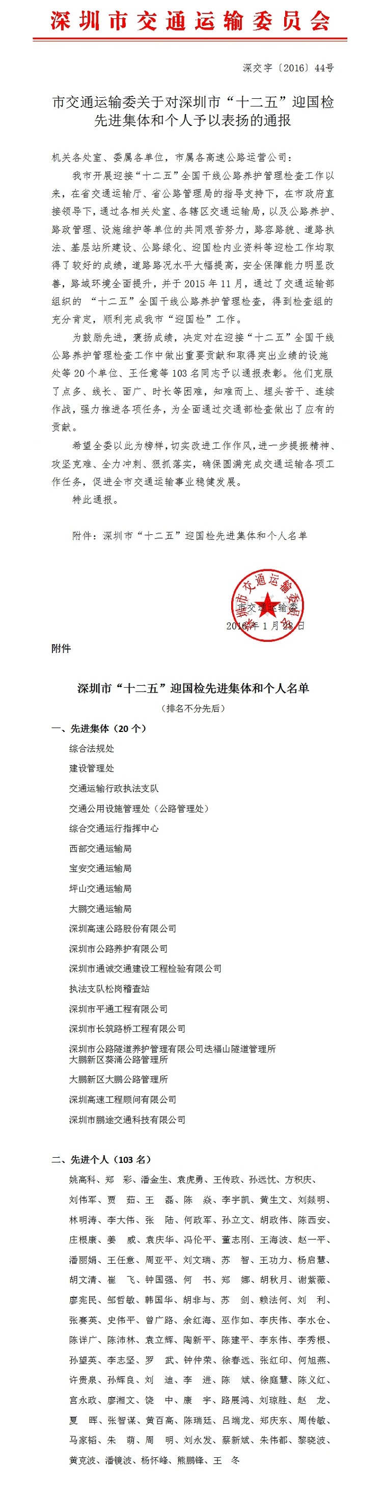 市交通运输委飞极速官网首页对深圳市“十二五”迎国检先进集体和个人予以表扬的通报