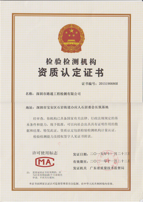 长筑公司下属的路通工程检测有限公司获得检验检测机构资质认定证书