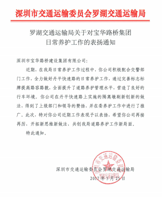 罗湖交通局发来表扬通知,高度肯定宝华路桥集团道路养护工作