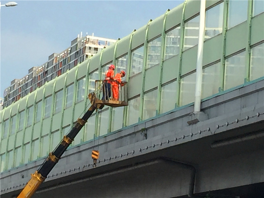 该桥的维护管养由宝华路桥集团路畅顺公司承担,在近期的养护巡查中,巡查人员发现该桥的隔音屏墙体出现松动问题,通过进一步技术勘检,该桥隔音屏的固定螺丝普遍有老化生锈的情况,存在严重安全隐患。为及时消除安全隐患,路畅顺公司紧急研究制定维保方案,并于5月27日启动梅龙立交隔音屏的加固维保工作。