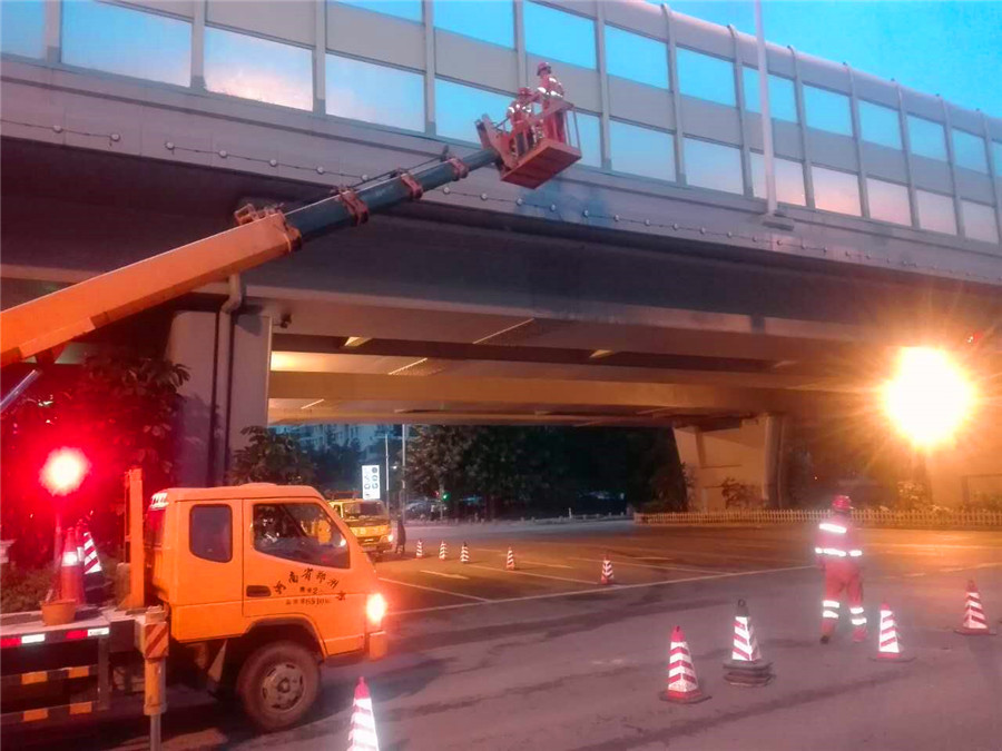 施工期间,正值高温酷暑天气,正午时分的桥面温度最高可达50多度,且该桥跨度大,外墙高达4.4米,整个维保作业难度非常大。