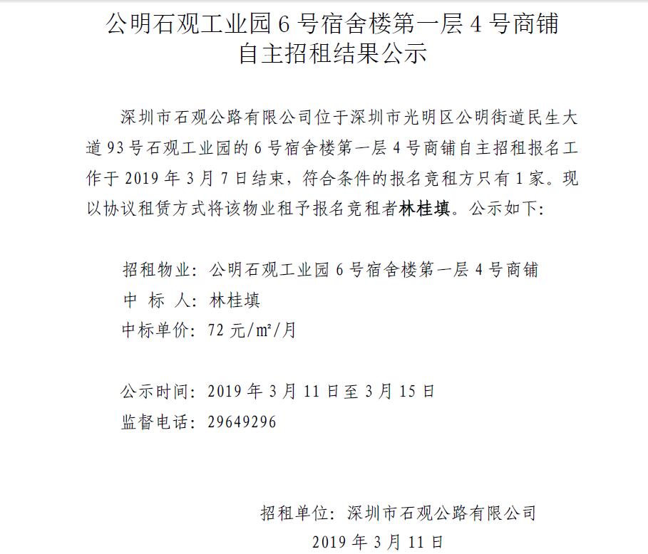 石观工业园6号宿舍楼第一层4号商铺自主招租结果公示