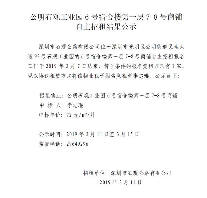 公明石观工业园的6号宿舍楼第一层7-8号商铺自主招租结果公示