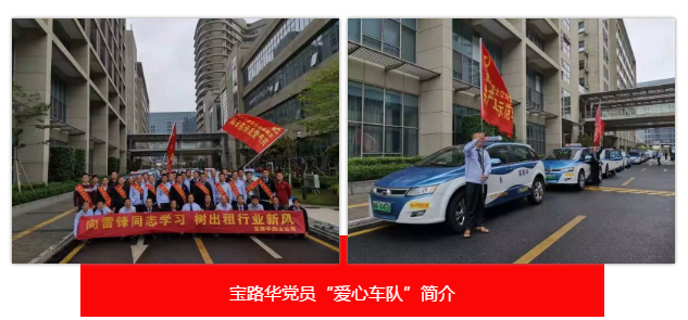 为了传承雷锋精神,2008年3月,深圳市宝路华新辉出租小汽车有限公司与深圳市宝路华宝城的士有限公司联合组建了深圳市第一家绿色出租行业的“爱心车队”,旨在奉献爱心,提高服务意识,弘扬雷锋精神,打造品质出租。爱心车队共有51台爱心车辆和51位爱心驾驶员。随着爱心公益事业的不断升华,“爱心车队”中的9名党员司机成立了新能源共产党员示范车队,每次开展公益活动时必 “亮明党员身份”提供热情服务,起到了先锋模范带头作用,也掀起了宝路华出租行业的爱心热潮。每年雷锋活动日、高考期间等特殊日子,“爱心车队”都风雨无阻地坚持开展爱心活动,为老、弱、病残、孕妇、考生等有需要的市民提供免费搭乘服务。从2008年至今11年来,“爱心车队”共出动志愿服务车辆约1700台,爱心行驶里程约9800公里,爱心接送旅客约5300人次。