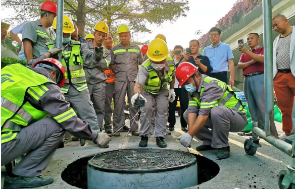 2019 年11 月27 日下午,市交通运输局设施处组织宝安管理局、宝排公司、路桥集团、天健养护公司等10 家公司的养护技术人员一行50 多人,来到107 国道新安5 路跨线桥路段辅道处,观摩了平通项目部新型防沉降雨水井盖更换新工艺演示活动。