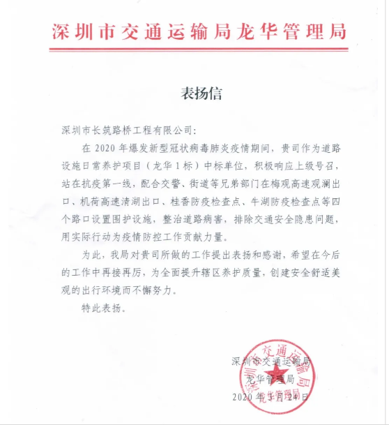 面对新冠肺炎疫情,路畅顺公司主动落实防控工作各项措施,在做好自身防疫工作的同时,积极配合深圳市交通运输局龙华管理局统一安排布署,在梅观高速观澜出入口、机荷高速清湖出口、桂香防疫检查点、牛湖防疫检查点等四个路口提供胶马、反光防撞胶桶等,协助转运、设置围护设施,整治道路病害,排除交通安全隐患,用实际行动为疫情防控工作贡献力量,得到了深圳市交通运输局龙华管理局高度肯定与表扬。
