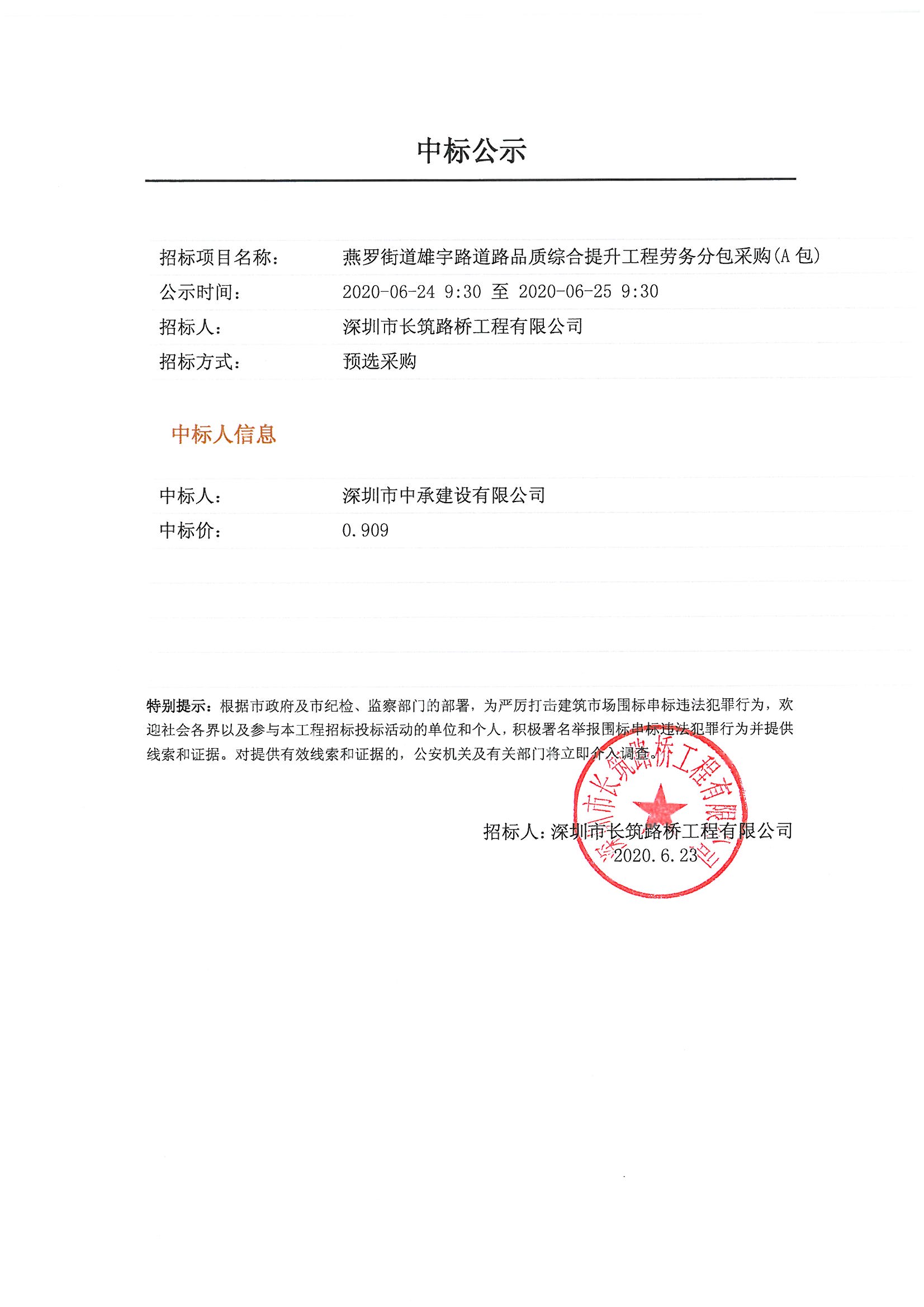 燕罗街道雄宇路道路品质综合提升工程劳务分包采购(A包)中标公示